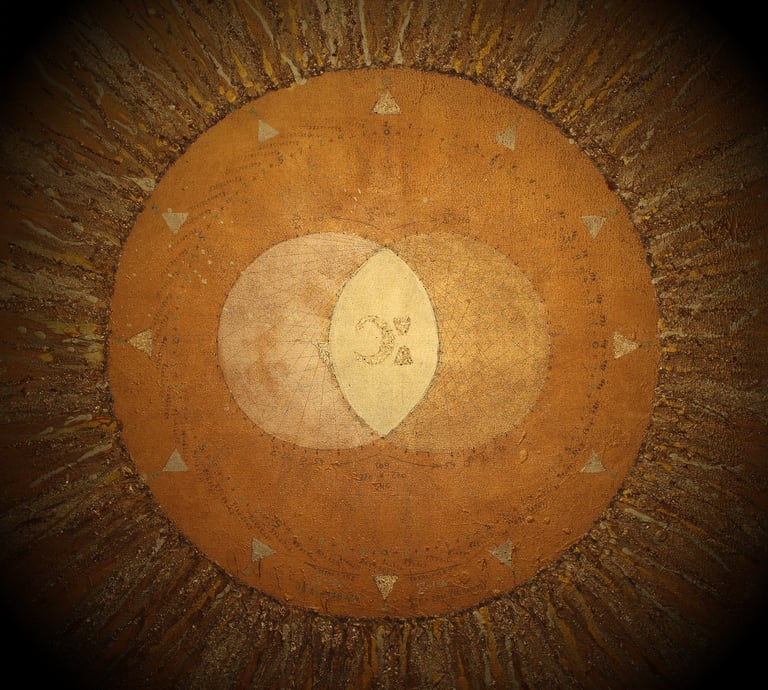 The painting encodes the origins of the 60-second clock, the 360 degree circle, the relationships of circles to triangles to waves and the origins of time and space itself.
